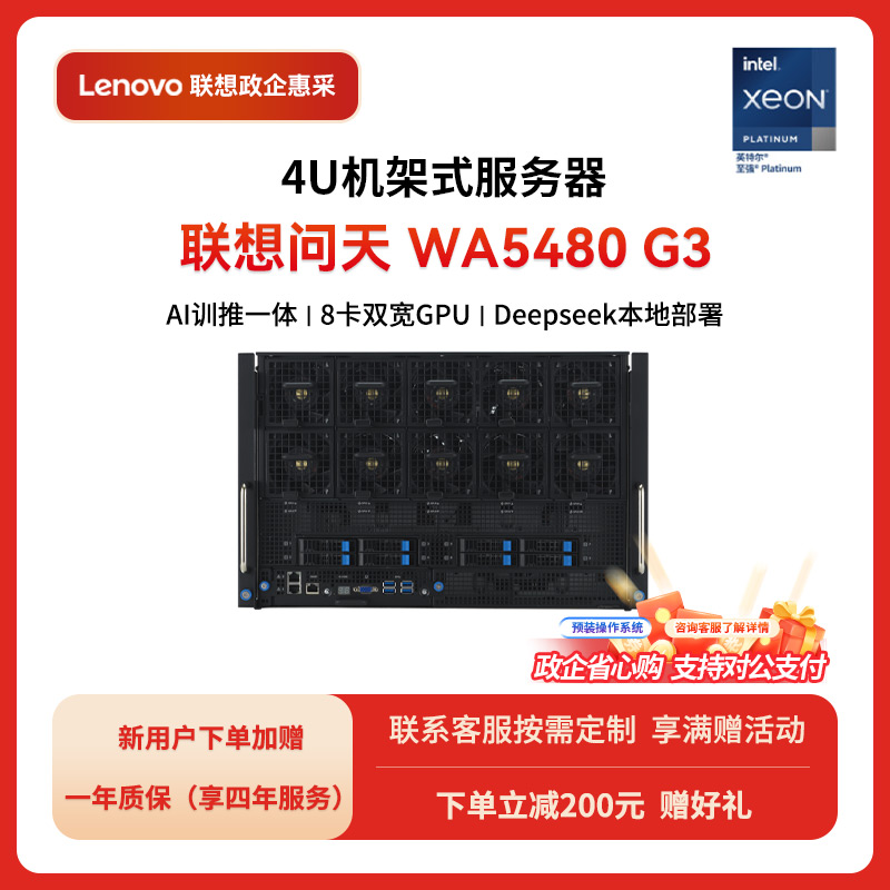 定制配置:联想问天WA5480 G3 4U机架式8卡GPU服务器主机 深度学习AI训练推理Deepseek本地部署一体机 2颗金牌6530 64核2.1G|256G丨2*1.92T固态+3*8T|4*L20 48G显卡|4x2700W电源